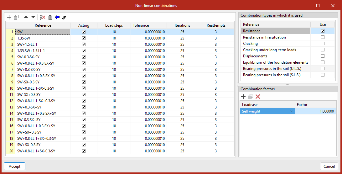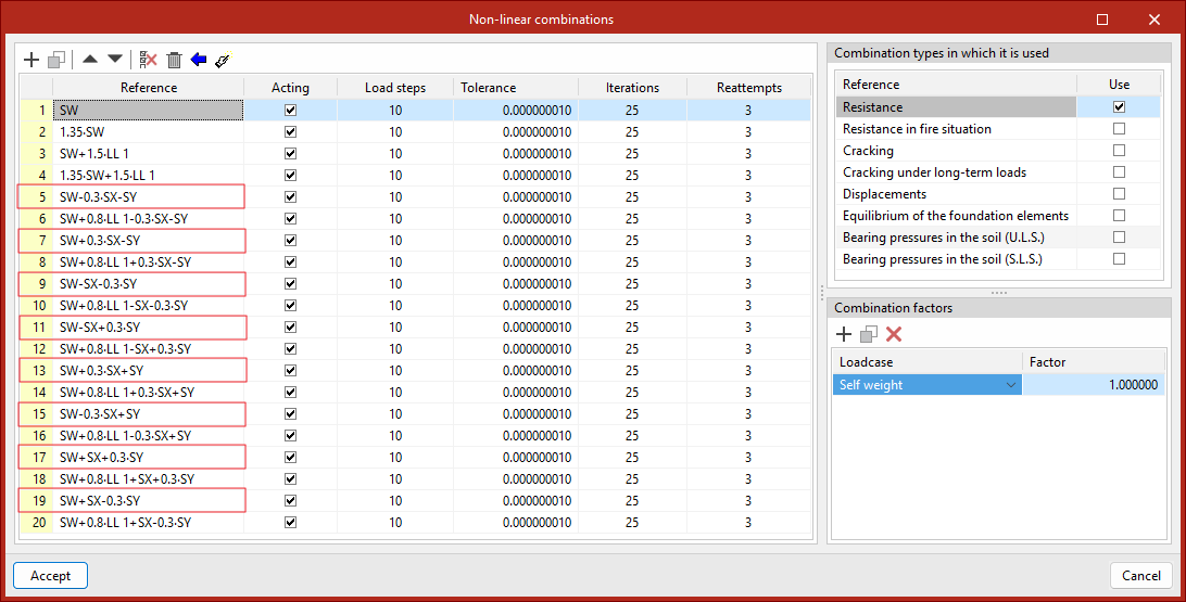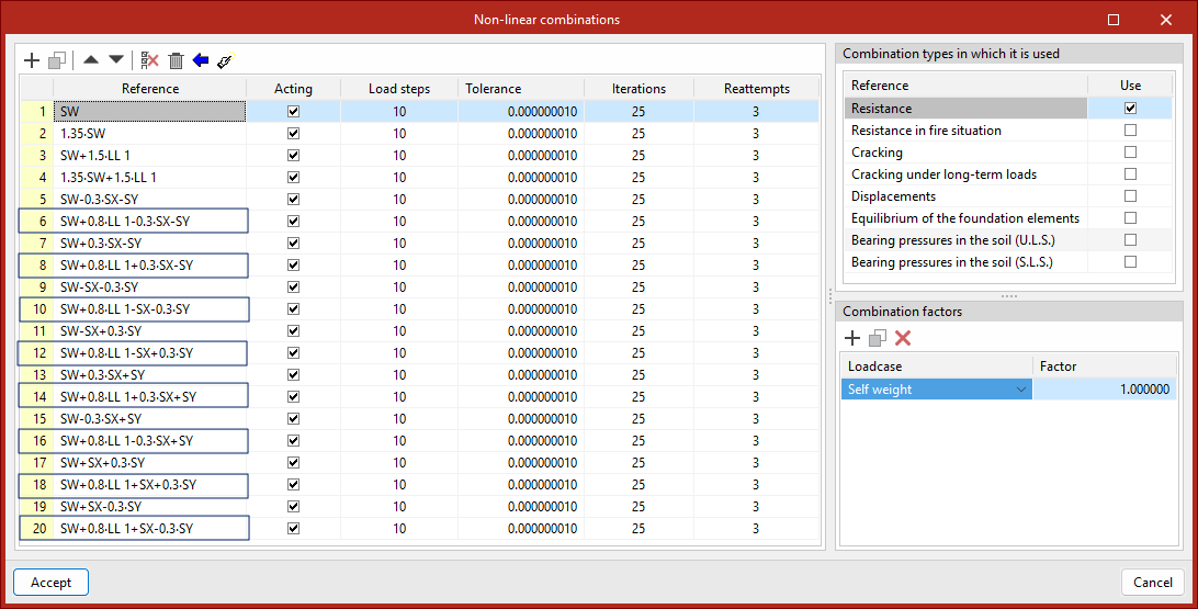 In order not to perform a modal spectral analysi for each non-linear seismic combination, the program carries out a preliminary study of the NLCs before starting the analyses. It generates groups of combinations from the combinations in which the behaviour of the non-linear elements is the same.