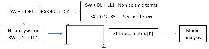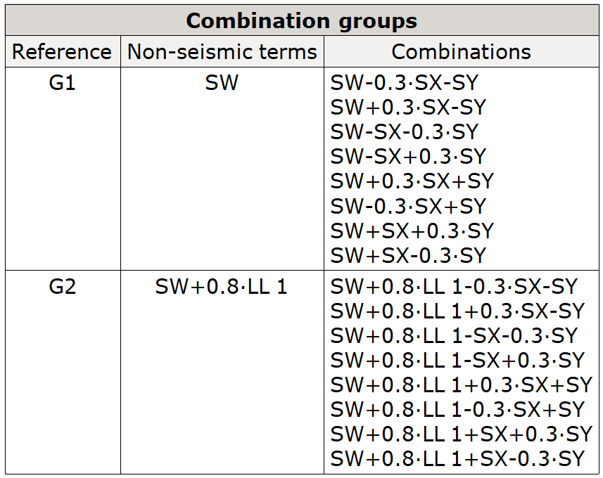 Analysing the non-seismic part, all those combinations involving the same loads with the same combination coefficients can be grouped together since, applying what was explained in the previous section, they would all start from the same design model for the modal analysis.