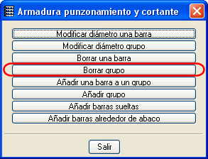 En versiones anteriores, la opción Borrar grupo del cuadro de diálogo Armadura de punzonamiento (pestaña Resultados, menú Losas/Reticulares > Modificar armaduras > Armadura de punzonamiento) permitía la eliminación de grupos de refuerzo a punzonamiento y cortante en losas y forjados reticulares seleccionándolos uno a uno. Ahora, también es posible borrar varios de estos grupos de barras mediante su selección con una ventana de captura.