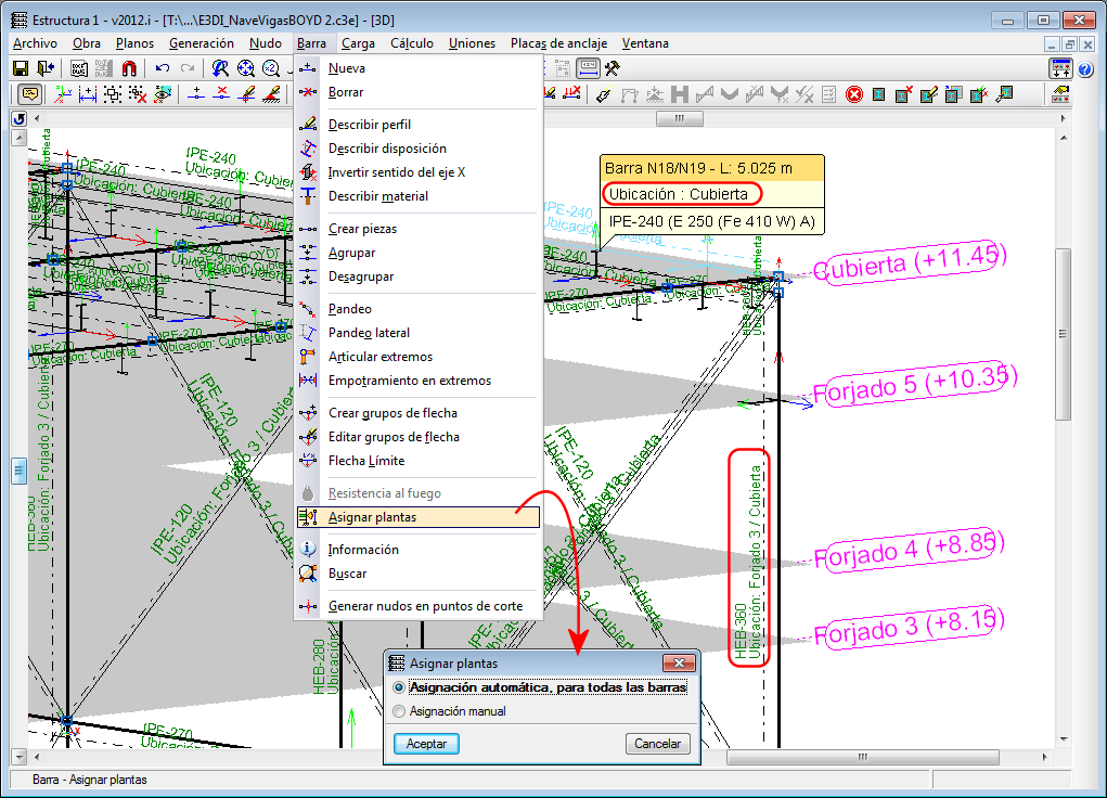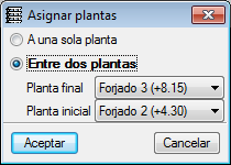 El usuario decide libremente a qué planta de las definidas en CYPECAD desea asignar las barras de la estructura 3D que está editando. Tras elegir esta opción, se deben seleccionar una o varias barras pulsando con el botón izquierdo del ratón una barra, seleccionando una o varias barras mediante ventanas de captura, o combinando ambas posibilidades de selección de barras. Una vez realizada la selección deseada, si se pulsa el botón derecho del ratón, el usuario podrá elegir a qué planta asignar las barras seleccionadas o entre qué dos plantas se encuentra la barra.