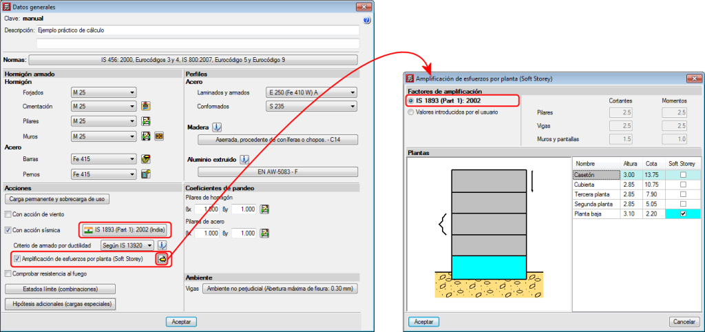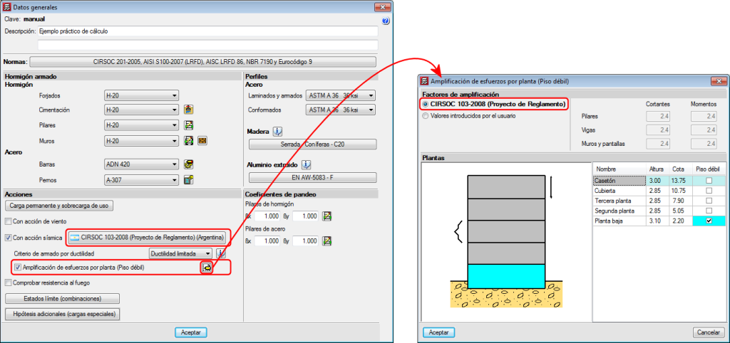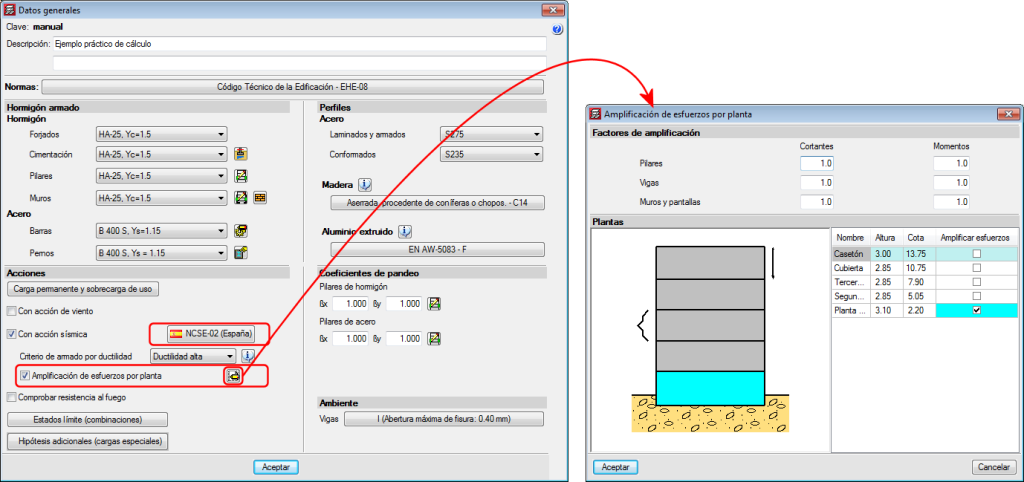 La versión 2013.l de CYPECAD permite introducir factores de amplificación de momentos y cortantes para pilares, vigas, muros y pantallas en las plantas que desee el usuario, independientemente de la norma seleccionada. Para ello se ha implementado en el diálogo Datos generales (menú Obra > Datos generales) la opción Amplificación de esfuerzos por planta. La activación de esta opción abre un diálogo con el mismo nombre. Si la norma seleccionada contempla el efecto de la menor rigidez de plantas con tabiquería más débil, el programa muestra en este diálogo los factores de amplificación de momentos y cortantes correspondientes para que el usuario seleccione las plantas donde desea aplicarlos. También se ofrece la posibilidad de que el usuario indique los factores que desee. Si la norma seleccionada no contempla estos efectos, el programa permite introducir al usuario los factores de amplificación que desee en las plantas que seleccione.