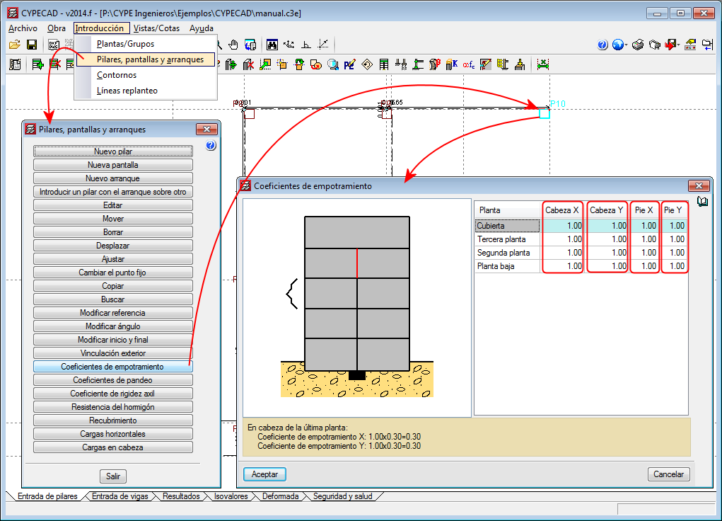 Desde versiones anteriores, CYPECAD permite modificar el coeficiente de empotramiento en cabeza y pie de cada tramo de pilar (solapa Entrada de pilares > menú Introducción > Pilares pantallas y arranques > Coeficientes de empotramiento > seleccionar un pilar).