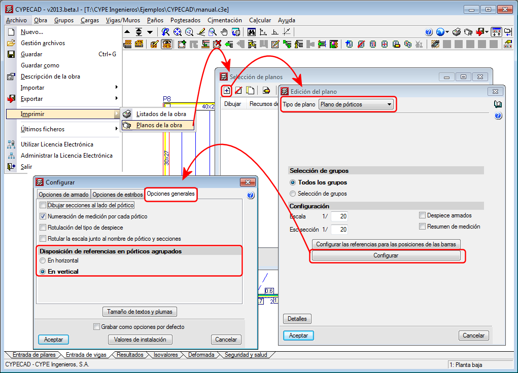 Se ha implementado la opción Disposición de referencias en pórticos agrupados (menú Archivo > Imprimir > Planos de la obra > botón Añadir > seleccionar en "Tipo de plano" Plano de pórticos > botón Configurar > solapa Opciones generales) que permite colocar las referencias de los pórticos agrupados una junto a otra (opción En horizontal) o una debajo de otra (opción En vertical).
