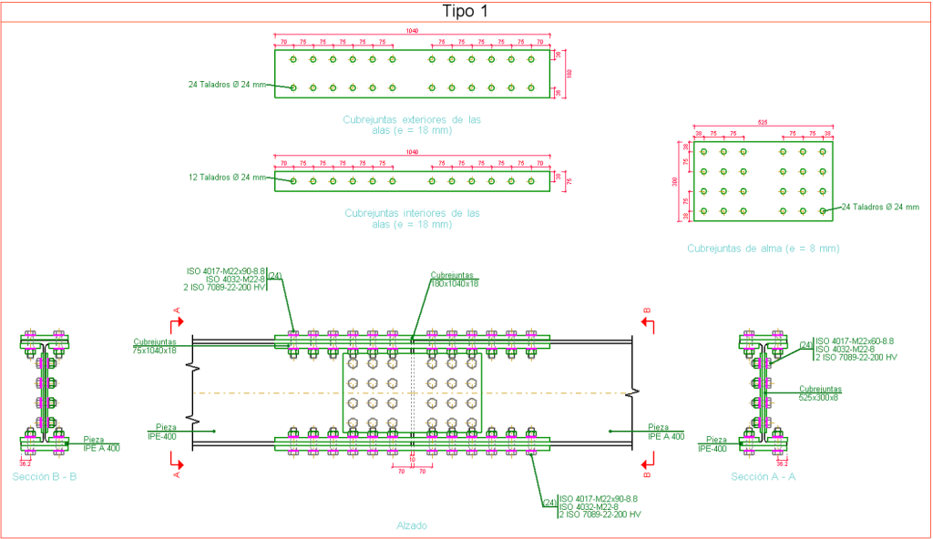 Se han implementado los empalmes de dos piezas mediante cubrejuntas atornillados en los módulos Uniones II y Uniones IV (atornilladas). Es posible su dimensionamiento con cualquiera de las normas que contemplan estos módulos (normas implementadas en Uniones II y normas implementadas en Uniones IV).