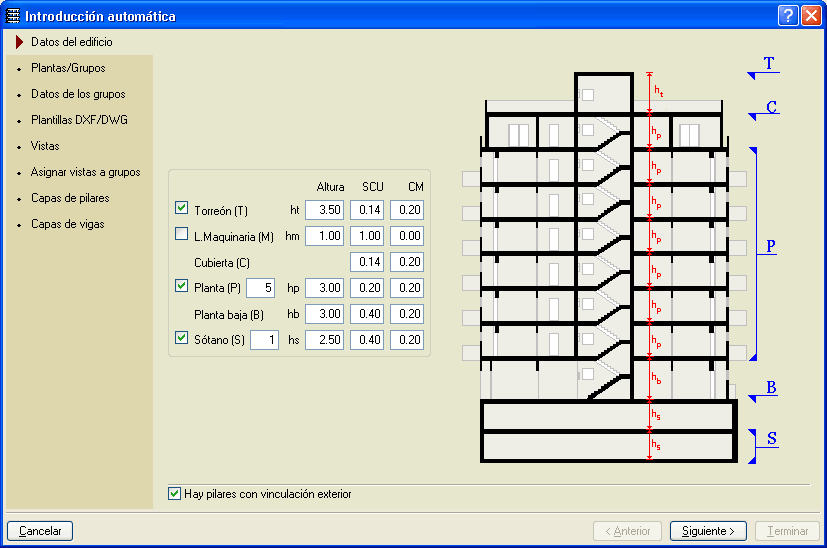 El usuario define la composición de plantas de la estructura: sótanos, planta baja, pisos, cubierta, losa de maquinaria y torreón. Salvo la planta baja y la cubierta, el resto de las plantas son opcionales. Se indican también las alturas, sobrecargas de uso y cargas muertas de cada planta.