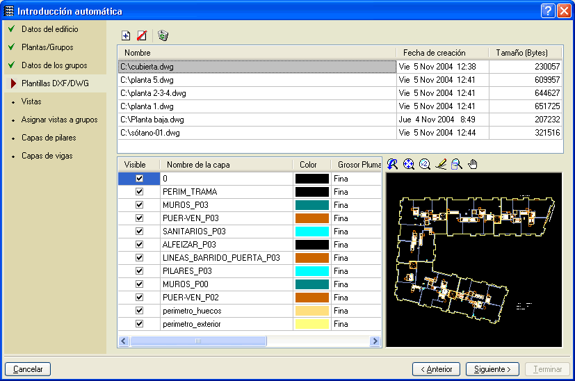 A continuación se seleccionan los DXF o DWG de la estructura y se definen las capas que representan a pilares, contornos exteriores y contornos de huecos.
