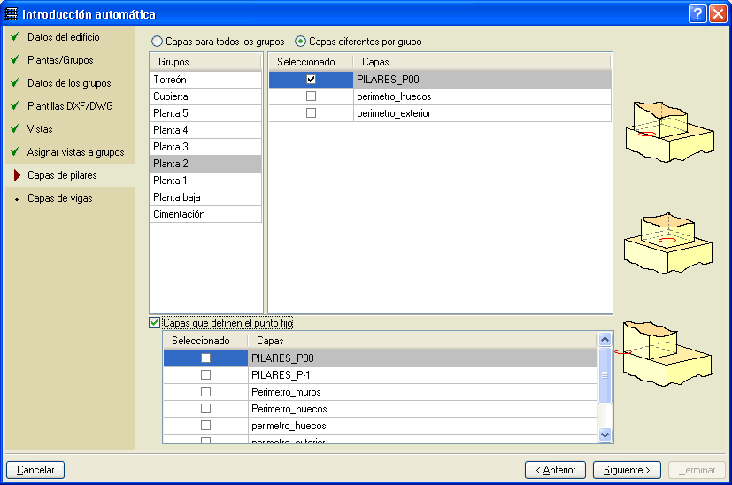 Con toda esta información el programa genera automáticamente la geometría de la estructura (pilares y vigas), incluso deduce los puntos fijos de los pilares si sus dimensiones son diferentes en cada planta definida en los DXF o DWG suministrados. También es posible indicar una capa que contenga la definición de puntos fijos de pilares para que no se calculen automáticamente.
