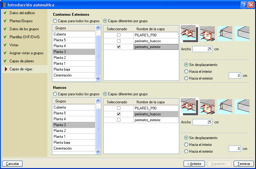 Es posible seleccionar qué tipo de vigas conforman los contornos exteriores e interiores e, incluso, definir opcionalmente un desplazamiento de la viga con respecto a la línea de contorno. Esto último es muy útil en el caso de que el contorno dibujado en el DXF o DWG represente el borde de fachada y no el borde estructural.