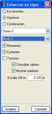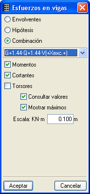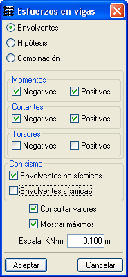Estas nuevas opciones permiten consultar además de las envolventes de esfuerzos (Momentos, Cortantes y Torsores), los esfuerzos por hipótesis simples y por la combinación de hipótesis que seleccione el usuario.
