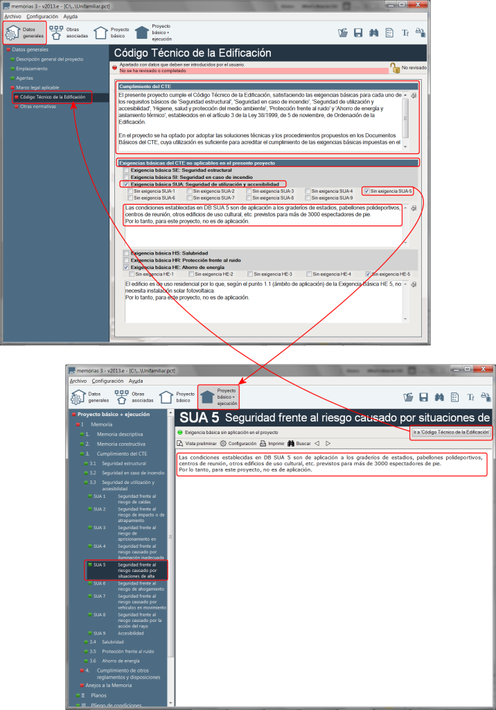 En este apartado se introduce el texto justificativo del cumplimiento de las distintas exigencias del CTE, al tiempo que se permite al usuario seleccionar aquellas exigencias que no sean de aplicación en el proyecto e introducir el texto justificativo de la no aplicación de cada exigencia básica.