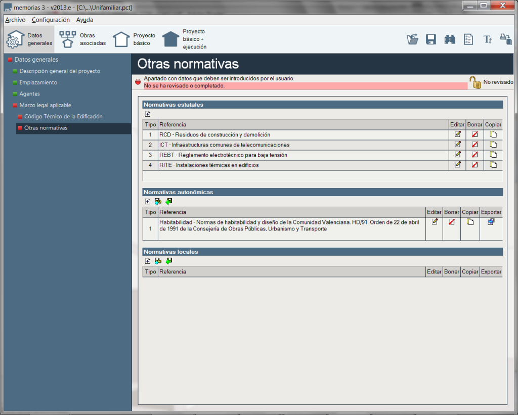 En este apartado aparecen tres nuevas listas de normativa aplicable en el proyecto, separadas según el ámbito de aplicación en estatales, autonómicas y locales.