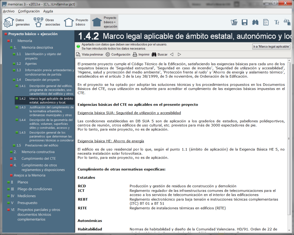 La versión 2013.e de Memorias CTE incluye el nuevo apartado Marco legal aplicable (dentro de la sección Datos generales), donde se centraliza la gestión de la normativa aplicable. Este apartado se divide en dos subapartados: Código Técnico de la Edificación y Otras normativas.