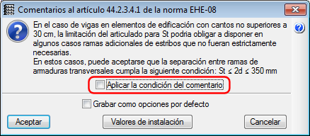 del apartado Acero > botón Opciones para vigas > Opción Comentarios al artículo 44.2.3.4.1 de la norma EHE-08). Recuerde que para activar esta opción, debe tener seleccionada la norma EHE-08 en CYPECAD.