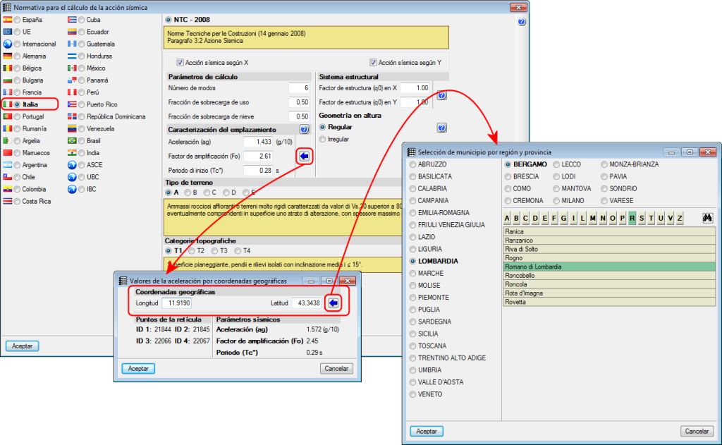 Esta norma ya estaba implementada en CYPECAD y en Nuevo Metal 3D desde la v.2011.e. Ahora se ha facilitado la introducción de los parámetros sísmicos que caracterizan el emplazamiento. El usuario puede indicar las coordenadas geográficas o el municipio al que pertenece dicho emplazamiento, y el programa introduce automáticamente sus parámetros sísmicos (aceleración, factor de amplificación y periodo de inicio).
