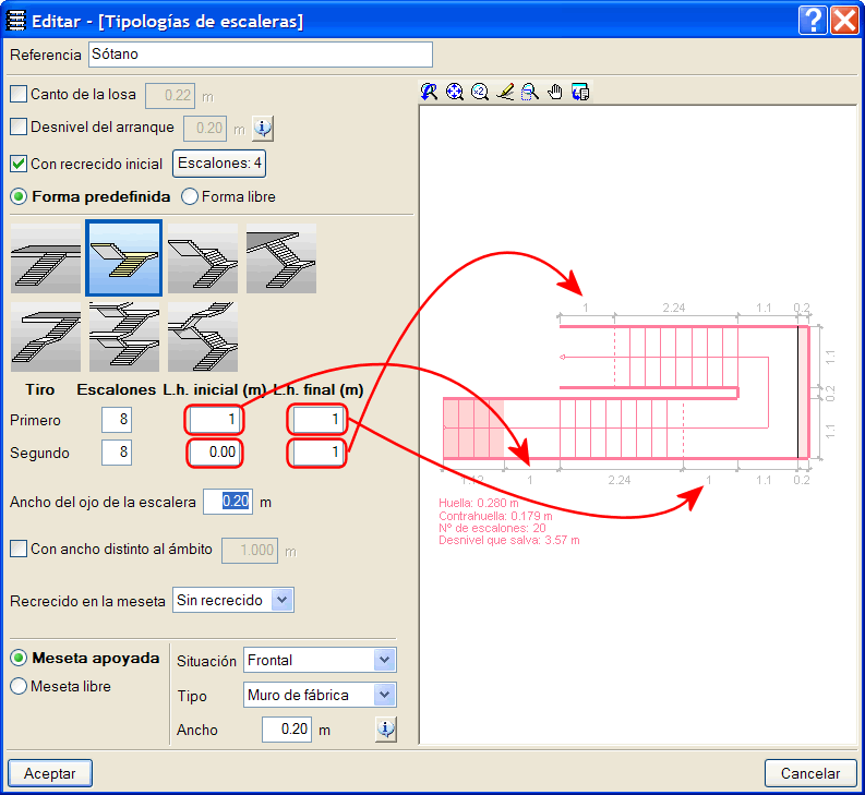 Los tiros rectos de cada tipología de escaleras pueden definirse con losas horizontales en su inicio y en su final. El usuario define la longitud de cada una de las losas que tendrán como ancho el ámbito de la escalera.