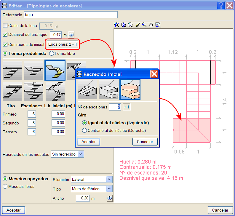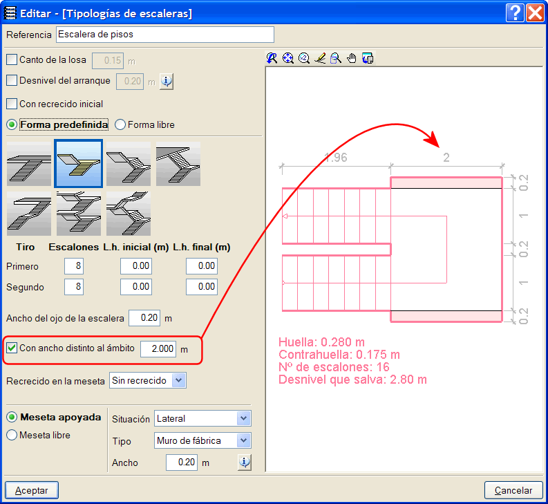 Las mesetas de media vuelta pueden definirse con un ancho diferente al ámbito del núcleo de escaleras