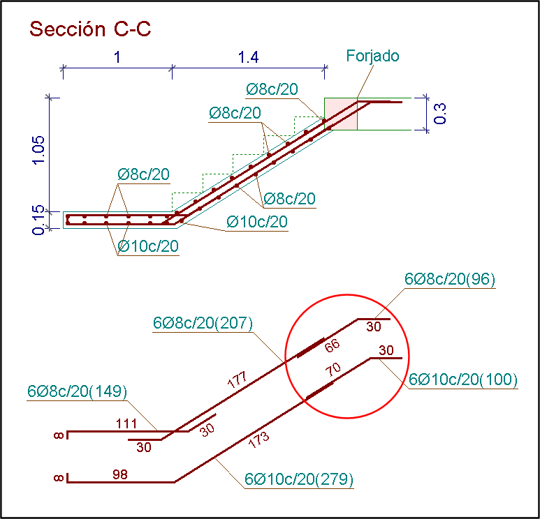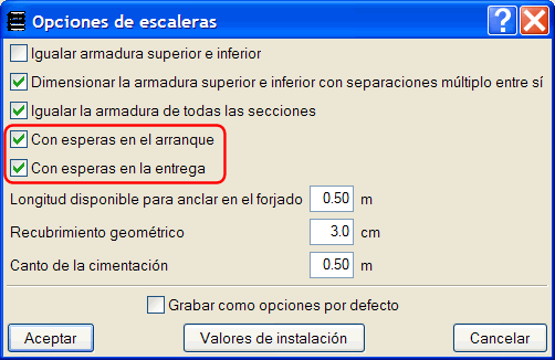 del apartado Acero para > botón Opciones de escaleras) hay dos opciones nuevas que permiten que, en el plano de despiece de armados de escaleras, las esperas se representen en los arranques y en las entregas de los forjados.