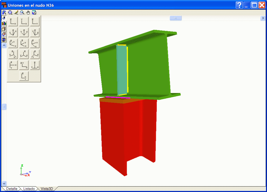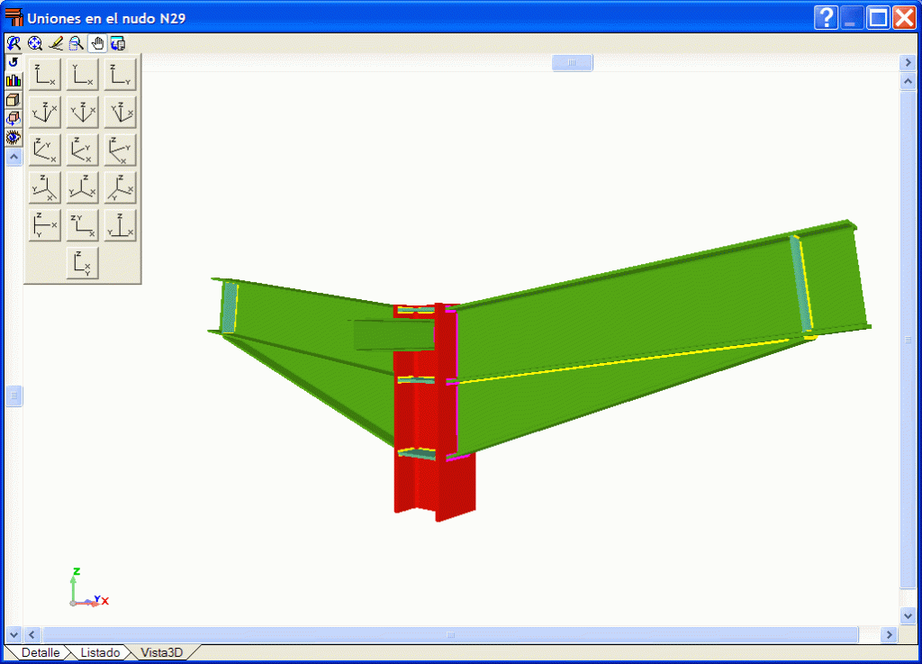 - Vistas 3D reales de Uniones. Es posible visualizar una vista 3D real de cada unión dimensionada por el programa en perspectiva cónica o isométrica. Los elementos que conforman la unión (pilares, vigas, rigidizadores, soldaduras) se dibujan con colores diferentes. Además, el usuario puede girar y ampliar libremente la vista 3D. Estas características facilitan en gran medida la comprensión del montaje de la unión.