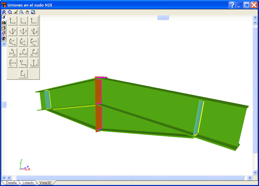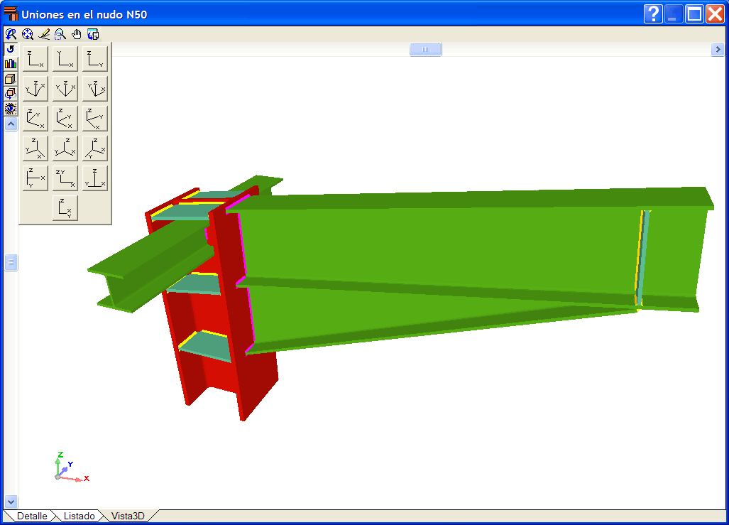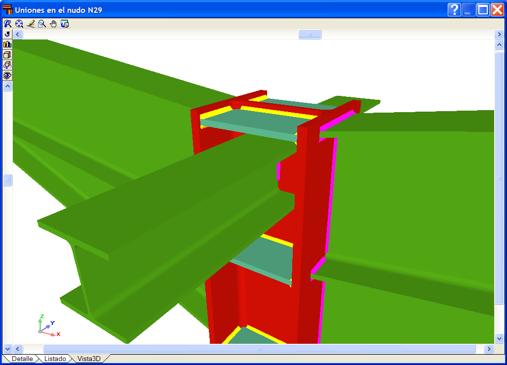 - Vistas 3D reales de Uniones. Es posible visualizar una vista 3D real de cada unión dimensionada por el programa en perspectiva cónica o isométrica. Los elementos que conforman la unión (pilares, vigas, rigidizadores, soldaduras) se dibujan con colores diferentes. Además, el usuario puede girar y ampliar libremente la vista 3D. Estas características facilitan en gran medida la comprensión del montaje de la unión.