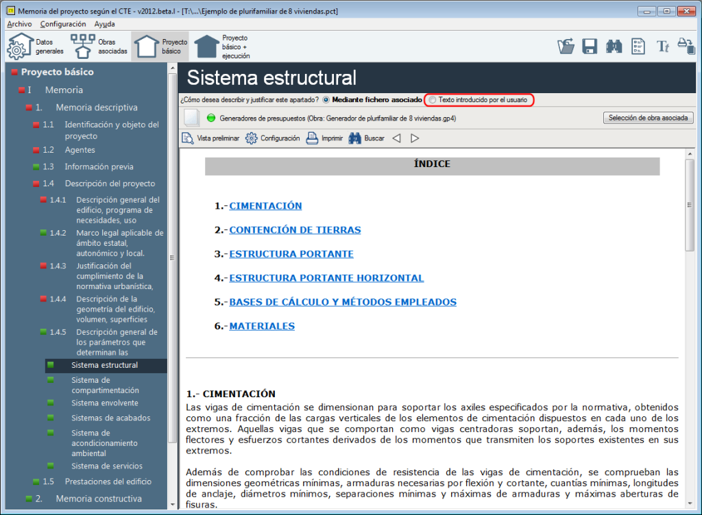 Si el usuario lo desea, el Proyecto básico que genera Memorias CTE puede desarrollarse por completo sin la necesidad de asociar obras de otros programas de CYPE (excepto el presupuesto que debe importarse de Arquímedes). Esto se ha hecho posible gracias a la incorporación de asistentes de introducción de datos y a la posibilidad de la introducción de textos en los apartados en los que en versiones anteriores solo era posible la importación de datos desde obras asociadas de los programas de CYPE.
