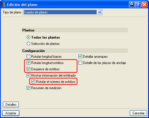Nuevas opciones de configuración del plano Cuadro de pilares