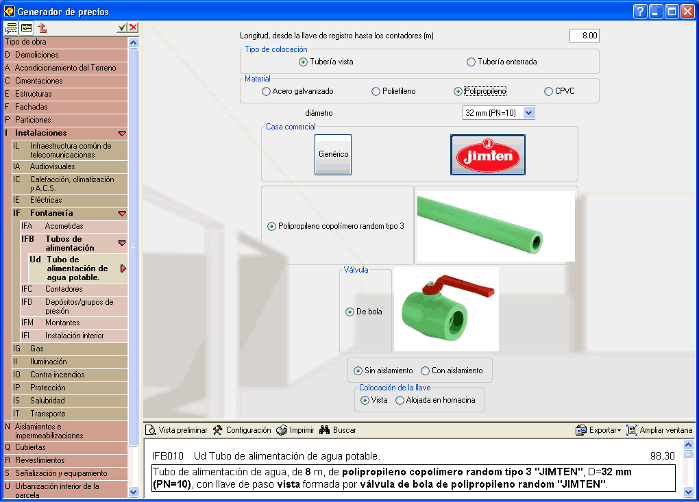 En el apartado IFB (Instalaciones - Fontanería - Tubos de alimentación), se han incluido los tubos de Polietileno, Polipropileno y CPVC.
