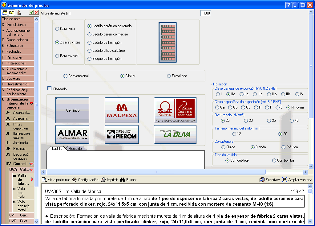 En algunos apartados donde antes no se podía cambiar el tipo de hormigón ahora sí es posible realizar esta selección. Por ejemplo, en el apartado UVA (Urbanización interior de la parcela - Cerramientos - Vallas).