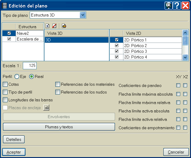 Puesto que en esta versión se han implementado las estructuras 3D integradas se ha creado el nuevo tipo de plano Estructura 3D, en el que es posible elegir las estructuras que se desean dibujar, así como sus vistas 2D. También se pueden configurar los elementos de las estructuras 3D que van a aparecer en el plano.