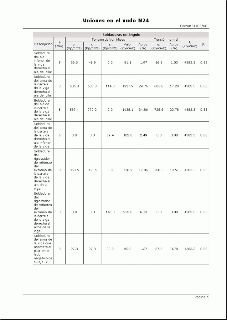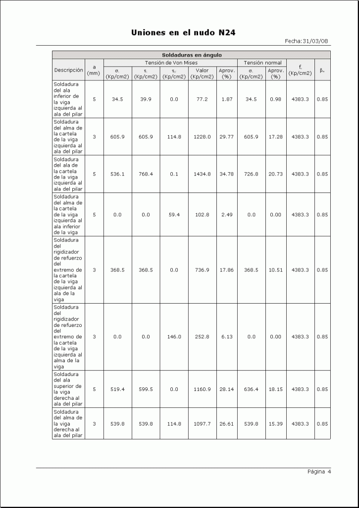 El programa descompondrá los esfuerzos del nudo, determinando las tensiones en cada uno de los cordones de soldadura de la unión, debiendo verificarse en cada uno de ellos la relación anterior.