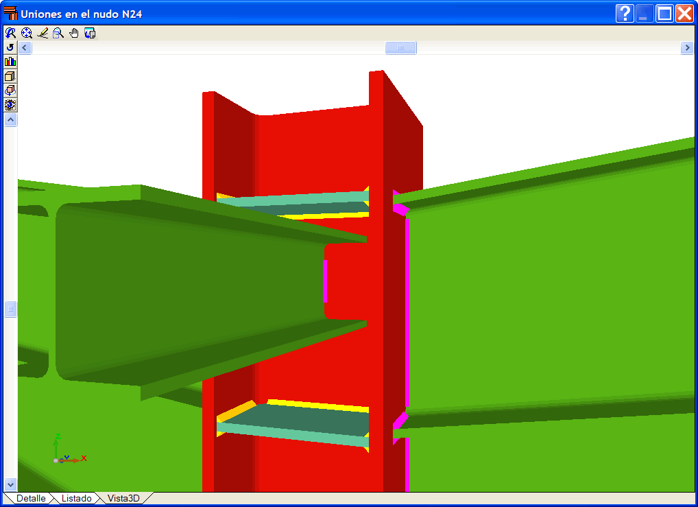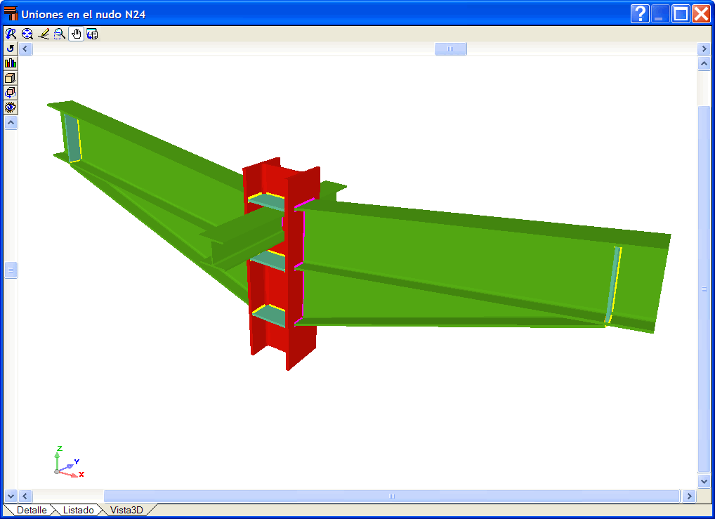 Si pulsa sobre un nudo en el que no se ha dimensionado ninguna unión, el programa mostrará una vista 3D con las barras que llegan a la unión para poder ver si hay alguna interferencia entre ellas de tal forma que no se pueda resolver la unión.
