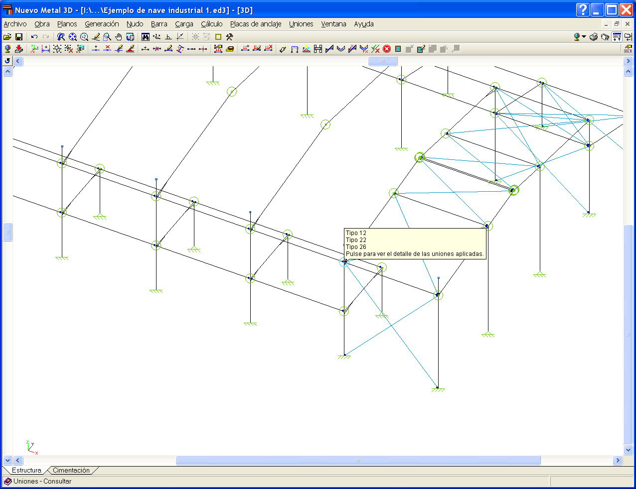 Tras el cálculo podrá consultar las uniones que han sido dimensionadas por el programa mediante las opciones Analizar y Consultar del menú Uniones.