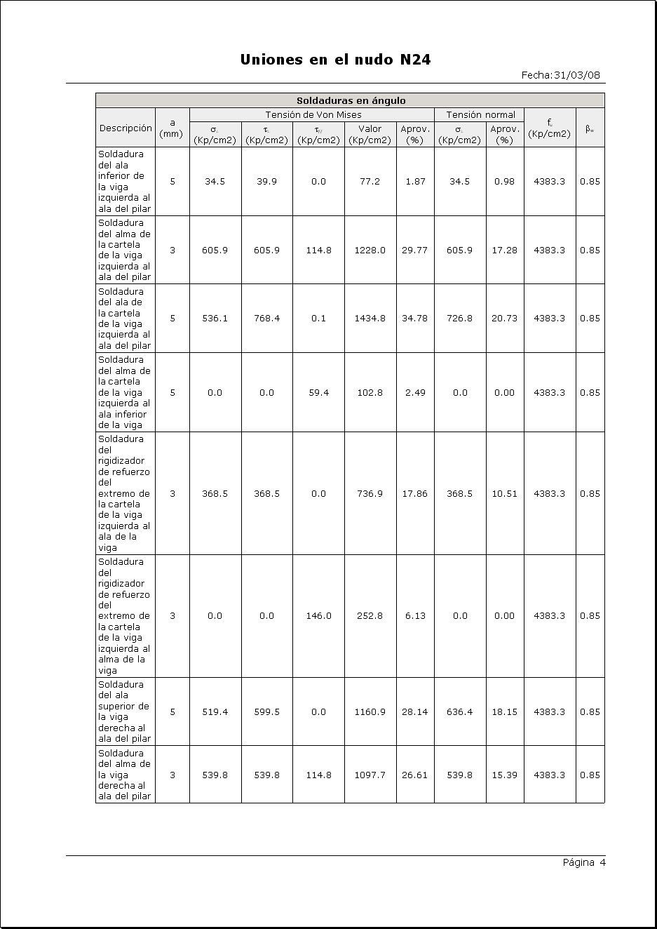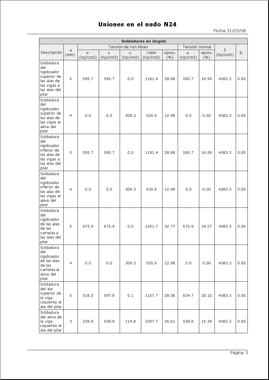 El programa descompondrá los esfuerzos del nudo, determinando las tensiones en cada uno de los cordones de soldadura de la unión, debiendo verificarse en cada uno de ellos la relación anterior.