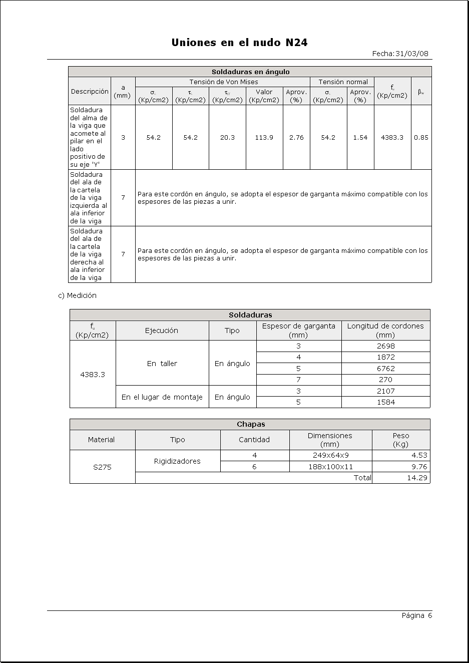 - Cuadro de medición conjunta de soldaduras y chapas de todas las uniones dimensionadas