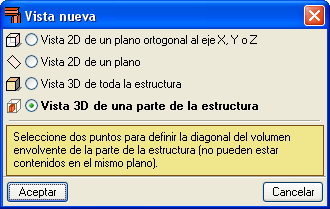 La creación de una ventana 3D parcial se realiza con la opción Vista 3D de una parte de la estructura del diálogo Vista Nueva (menú Ventana > Abrir nueva). Con esta opción el usuario genera un volumen de visión en forma de prisma rectangular mediante la introducción de los extremos de su diagonal. A continuación, el programa solicita la introducción de un nombre con el que se identificará la vista 3D parcial creada. Esta ventana 3D contiene los nudos y barras incluidos totalmente en el volumen de visión y las barras que se encuentren parcialmente dentro de dicho volumen.