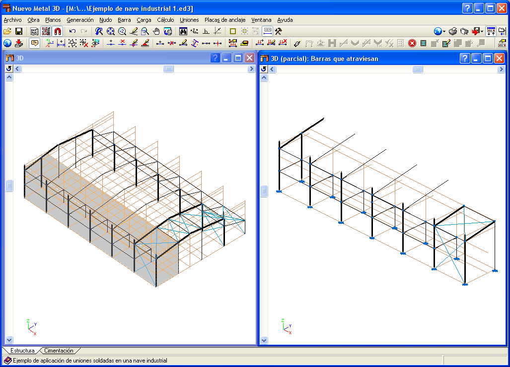 Aunque en una ventana 3D parcial también se representan las barras que se encuentren parcialmente dentro de dicho volumen, sólo se pueden introducir nudos o barras que se encuentren totalmente dentro del volumen de visión, por lo que sólo se dibujan las líneas de referencia en su interior. De este modo, se evita la introducción de una barra que pueda cortar a otra no representada en la ventana 3D parcial.