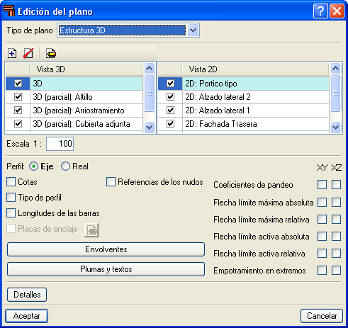 Las ventanas 3D parciales se pueden incluir en los planos con la misma información que contienen las ventanas 3D completas. Por ello, en el diálogo Edición del plano (menú Archivo > Imprimir > Planos de la obra > añadir o editar un plano de Estructura 3D) es posible añadir, activar o desactivar las vistas 3D parciales creadas.