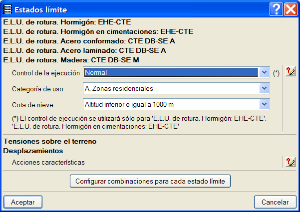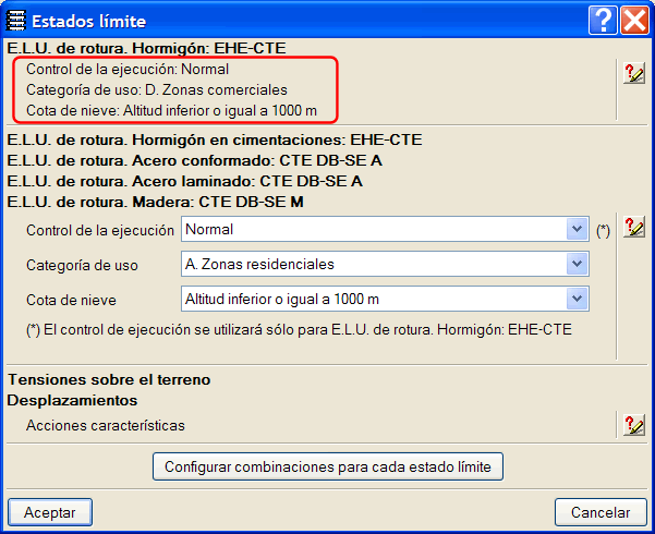 Cuando el usuario establece una configuración particular de las combinaciones para algún estado límite (menú Obra > Datos generales > botón Estados límite (combinaciones) > botón Configurar combinaciones para cada estado límite > seleccionar un material > activar opción Particulares y establecer configuración particular), se visualiza dicha configuración en el cuadro de diálogo Estados límite.