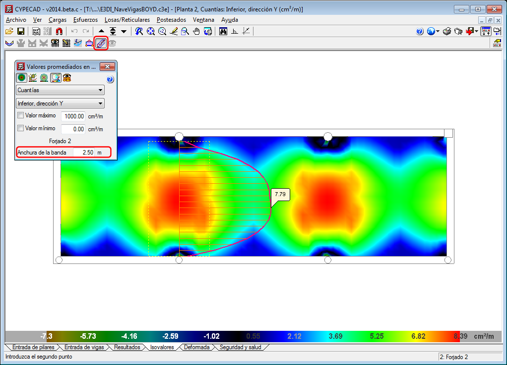 Se han implementado dos nuevas opciones en la solapa Isovalores para consultar en pantalla los valores promediados de los esfuerzos, los esfuerzos de dimensionamiento o las cuantías de forjados de losa maciza y reticulares. Es posible visualizar el valor promediado entre dos puntos o los valores promediados en una banda, ambos en las direcciones de armado de la losa.