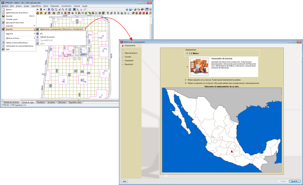 A partir de la versión 2014.c, CYPECAD ofrece la generación del presupuesto y la medición de la estructura de hormigón calculada teniendo en cuenta las unidades de obra y los precios del Generador de precios de México. Para ello, es necesario instalar CYPECAD en español, en español para Argentina o en español para México, y la obra debe estar calculada con la norma de hormigón NTCRC:2004 (México).