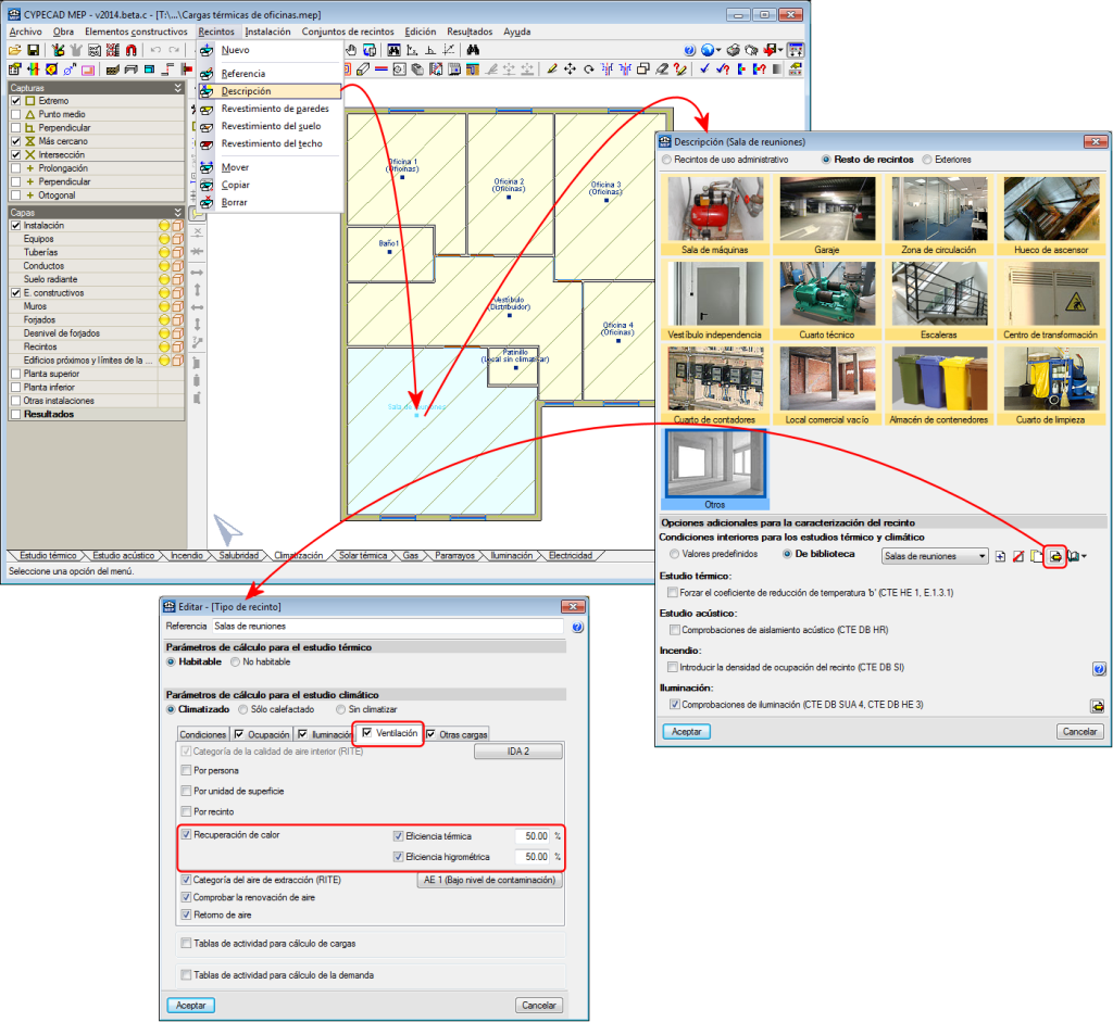 A partir de la versión 2014.c, CYPECAD MEP permite definir los valores de eficiencia térmica e higrométrica de los sistemas de ventilación con recuperación de calor en las condiciones interiores de los recintos (dentro del apartado de ventilación). De este modo, el efecto de dichos sistemas de ventilación se verá reflejado en los resultados del cálculo de cargas térmicas sin necesidad de introducir la instalación.