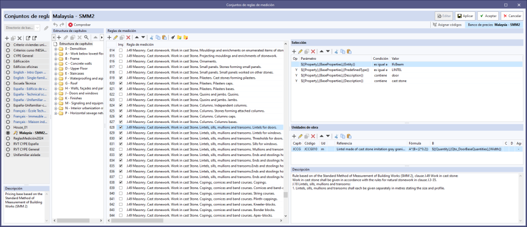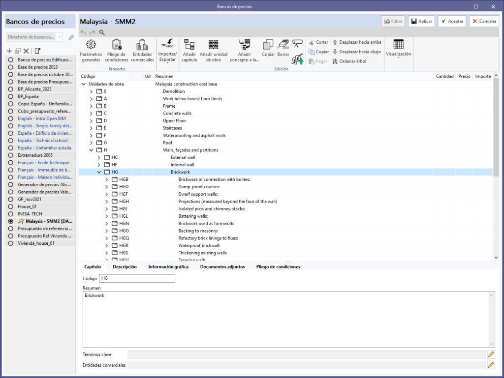 Incorporación de más apartados de la norma Malaysian Standard Method of Measurement for Building Works (SMM2)