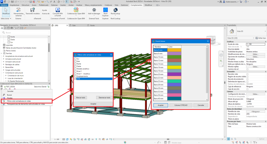 Esta utilidad posibilita la asignación de colores a las armaduras en función de su diámetro para las vistas disponibles que seleccione el usuario sin necesidad de crear un filtro para cada una de las mismas. Los colores serán personalizables por el usuario, de igual forma se dispondrá de la serie de colores utilizados en el programa de cálculo original.