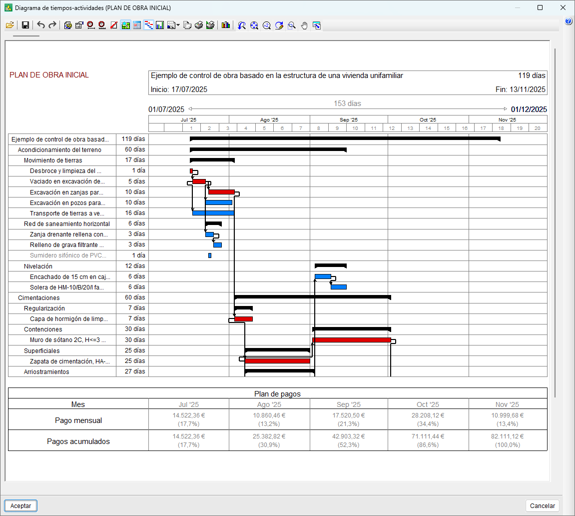 Elabora un plan de pagos en una tabla que aparece bajo el diagrama de Gantt. En esta tabla se representan los pagos mensuales y acumulados que se esperan en la obra.