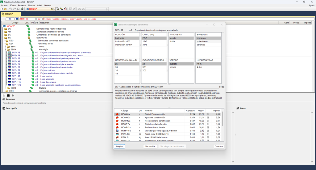 Esa versión, denominada Arquímedes. Edición IVE, incluye mediciones (con o sin líneas de detalle de medición), presupuestos y pliegos de condiciones de bancos en formato FIEBDC-3.