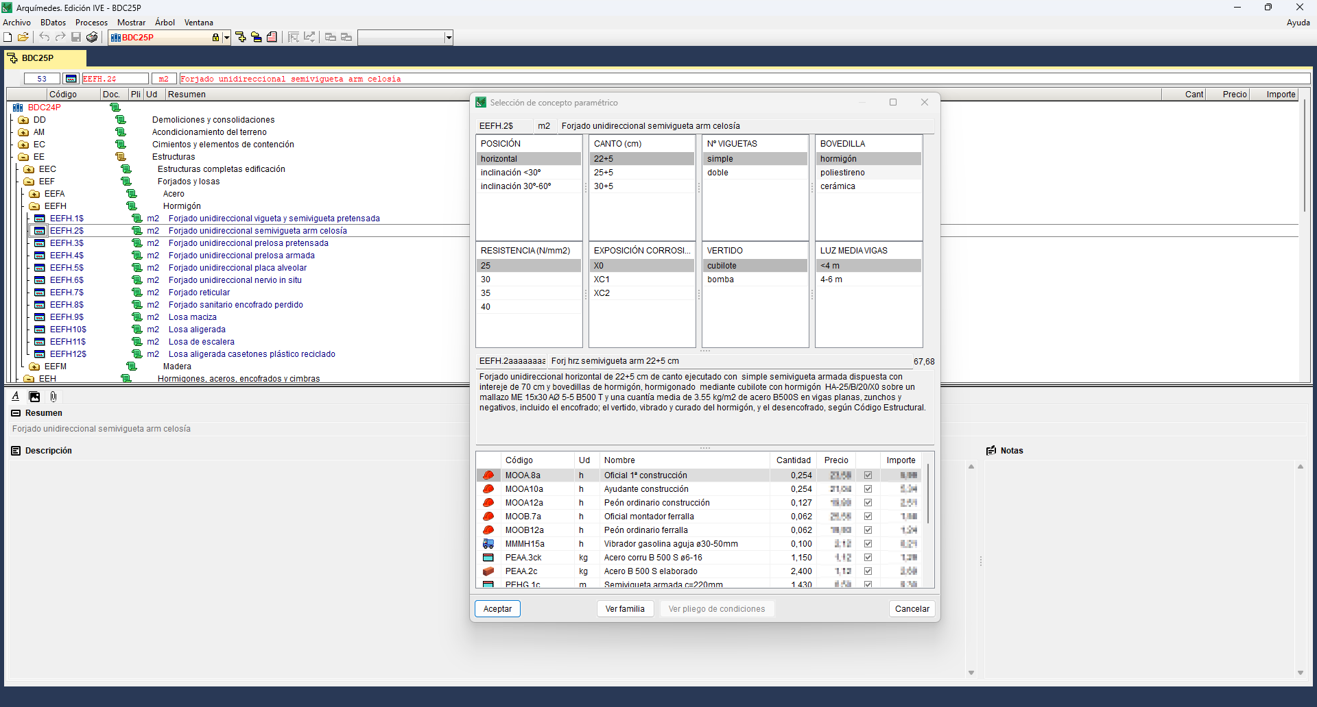 Arquímedes. Edición IVE trabaja con bancos de precios paramétricos (incluso compilados en DLLs), con precios múltiples (precio de mano de obra, materiales, etc., correspondientes a cada provincia), y con pliegos de condiciones (si el banco de precios con el que trabaja dispone de pliegos de condiciones). Incluye un diccionario para la localización rápida de conceptos a partir de términos clave. Asocia gráficos a partidas, a capítulos y a precios unitarios.