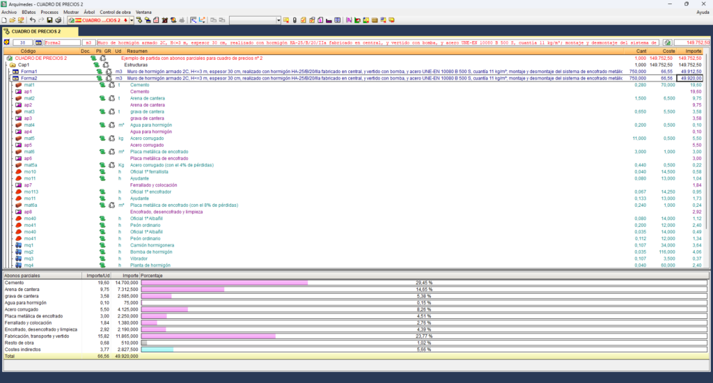 Arquímedes permite obtener correctamente el "Cuadro de precios nº 2" mediante la inclusión de conceptos de tipo abono parcial en la descomposición de las partidas. Este documento es necesario para valorar los distintos estados de ejecución de las unidades de obra en caso de paralización de los trabajos.