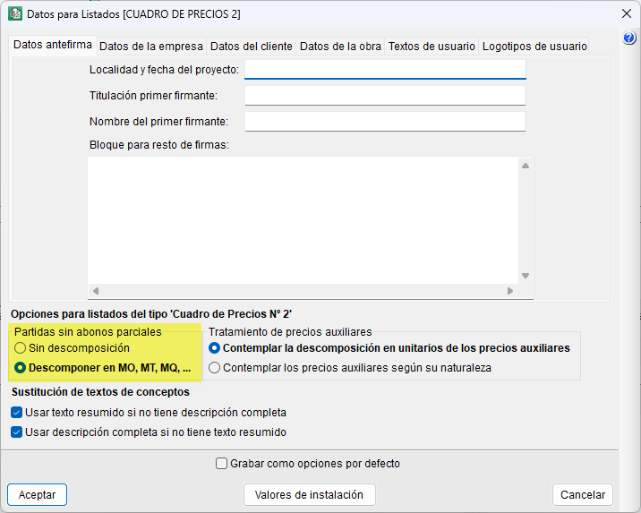 - El botón "Datos listado" permite acceder a los datos de antefirma, de la empresa, del cliente, de la obra y a la configuración del logotipo de usuario. Además, permite configurar las opciones para listados del tipo "Cuadro de precios nº 2".