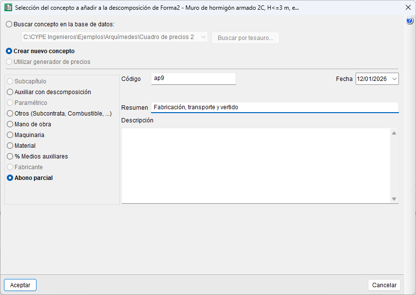 En el cuadro de diálogo "Selección del concepto a añadir a la descomposición de...", se debe marcar "Crear nuevo concepto" y "Abono parcial", indicando al menos su código y resumen.