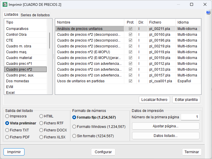 - A continuación, desde la selección del formato de los números, lo lógico es que se trabaje con "Formato fijo", así los números se imprimen con el mismo formato de presentación que se utiliza en las ventanas del programa.