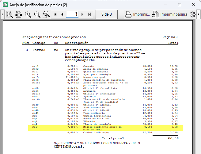 Si en los abonos parciales se han incluido medios auxiliares asociados a la mano de obra, para una correcta justificación de precios debe utilizarse el listado "Anejo de justificación de precios (2)", fichero "pl_00114_2.pla" del tipo "Justif. Precios", que traslada dichos importes al final de la partida.